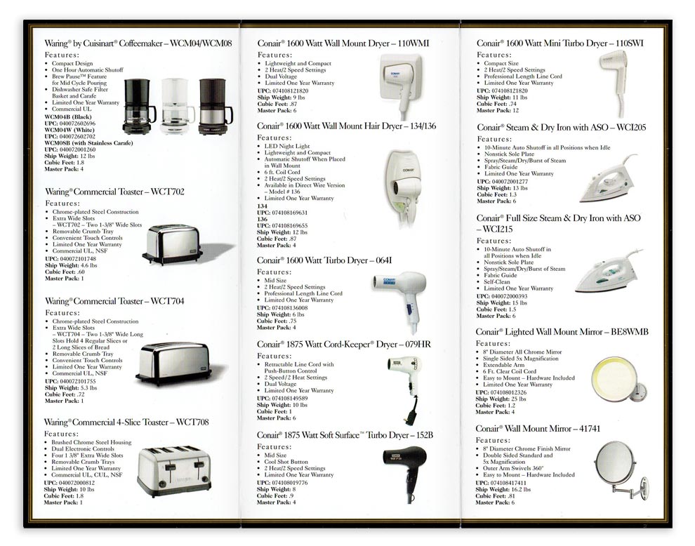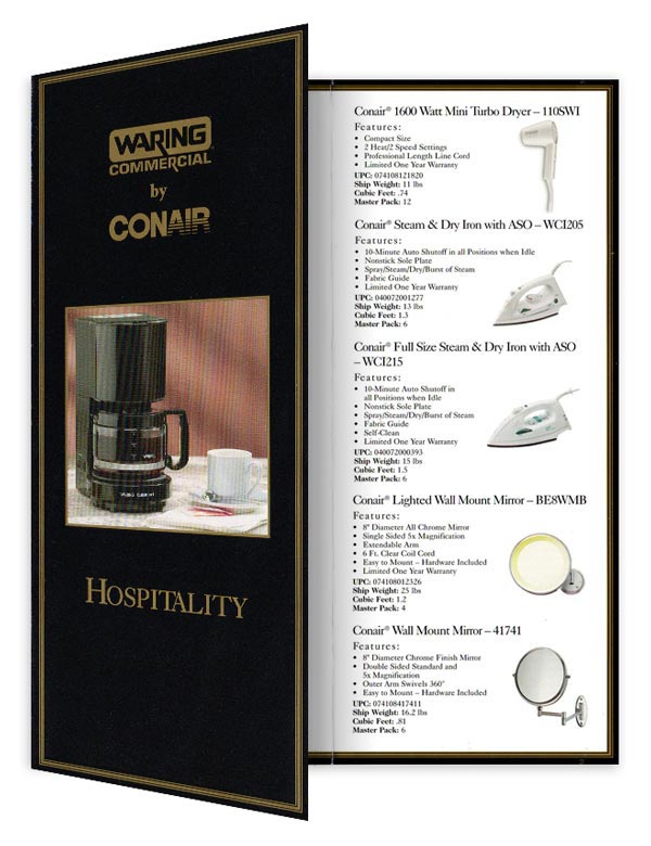 Tri-fold brochure featuring a product line of commercial grade hospitality accessories