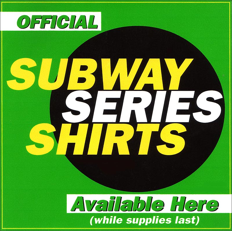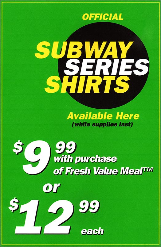Bold attention grabbing store window hangers used to promote t-shirts for the 2000 MLB World Series N.Y. Yankees vs. N.Y. Mets "Subway Series"